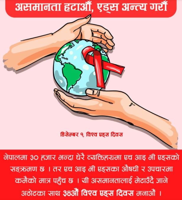 काठमाण्डौ, मंसिर १५ । आज ३४ औं विश्व एड्स दिवस, नेपालमा विभिन्न जनचेतनामूलक कार्यक्रम गरी मनाइँदैछ । यस वर्ष दिवसको नारा ‘असमानता हटाऔं, एड्स अन्त्य गरौँ’ भन्ने तय गरिएको छ ।