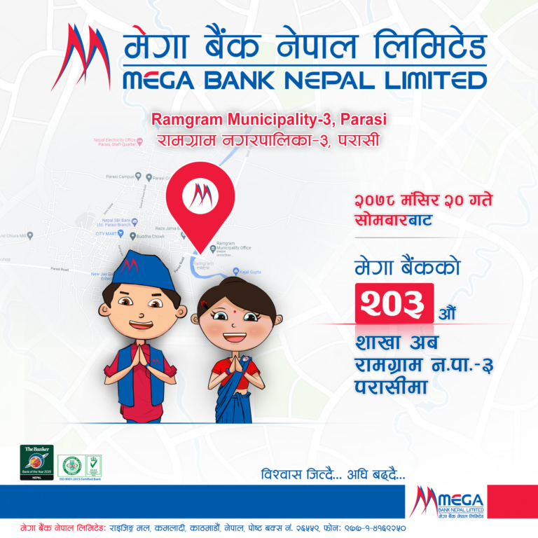 काठमाडौँ, २२ मंसिर । मेगा बैंक नेपाल लिमिटेडले परासीमा नयाँ शाखा विस्तार गरेको छ । मेगा बैंकले लुम्बिनी प्रदेशको नवलपरासी जिल्ला (सुस्ता पश्चिम)को सदरमुकाम परासीस्थित रामग्राम नगरपालिका वडा नम्बर ३ मा नयाँ शाखा विस्तार गरेको हो । यो मेगा बैंकको २०३औं शाखा हो ।