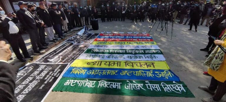 काठमाडौं, २२ मंसिर । सर्वोच्च अदालत परिसरमा आज फेरी नेपाल बार एसोसिएशनले विरोध प्रदर्शन गरेको छ ।