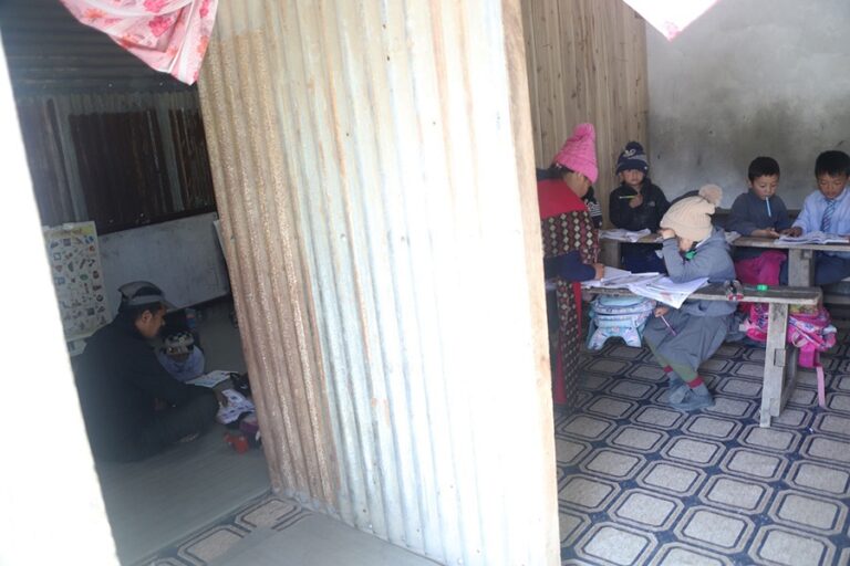 काठ र जस्तापाताले बार लगाई पठनपाठन गराउँदा एक कक्षाको आवाज अर्कोमा सुनिने भएपछि पठनपाठन प्रभावकारी हुनसकेको छैन् ।-तस्वीर : रवीन्द्र काफ्ले-रासस