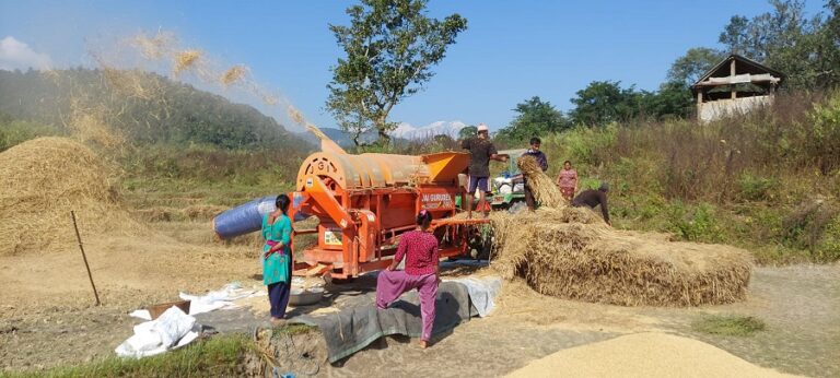 तनहुँ २४ मङ्सिर: व्यास नगरपालिका–६ स्थित मादीबेँसीमा थ्रेसरको सहायताले धान झार्दै । यो समय किसानका लागि मानो खाएर मुरी भित्र्याउने समयको रुपमा लिइन्छ ।-तस्वीर : सानेबहादुर नेपाली-रासस