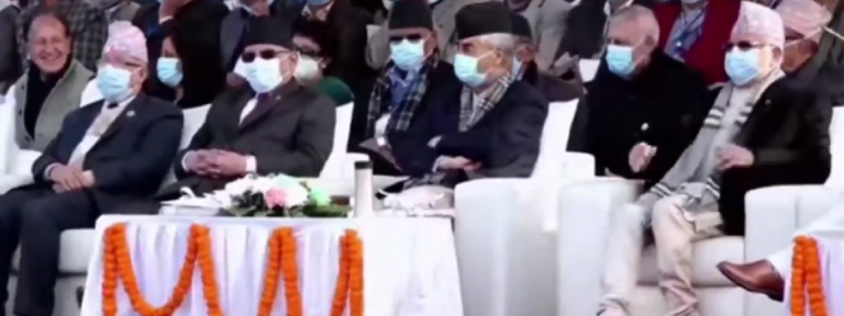 प्रचण्ड र माधव नेपालसँग एउटै मञ्चमा ओली महिनौं पछि पहिलोपटक बसेका हुन् । प्रचण्ड र नेपालसँग ओलीको पानी बाराबारको स्थिति छ ।