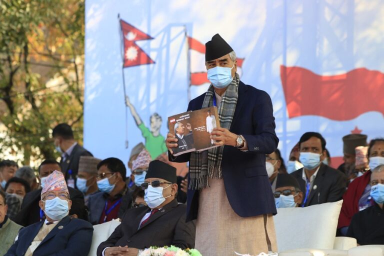 काठमाडौँ, २४ मङ्सिर: नेपाली काँग्रेसका सभापति एवम् प्रधानमन्त्री शेरबहादेर देउवा १४औ महाधिवेशनको अवसरमा शुक्रबार क्रान्तिका नायक खुमबहादुर खड्का नामकको पुस्तक विमोचन गर्दै ।-तस्वीर : रत्नकृष्ण श्रेष्ठ-रासस