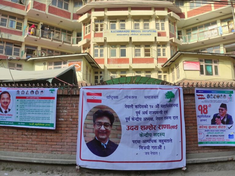 उनीहरुले काठमाडौं मोडल अस्पतालको पर्खालमा समेत प्रचार सामाग्री राखेका छन् । तस्विरः मुकुन्द कालीकोटे