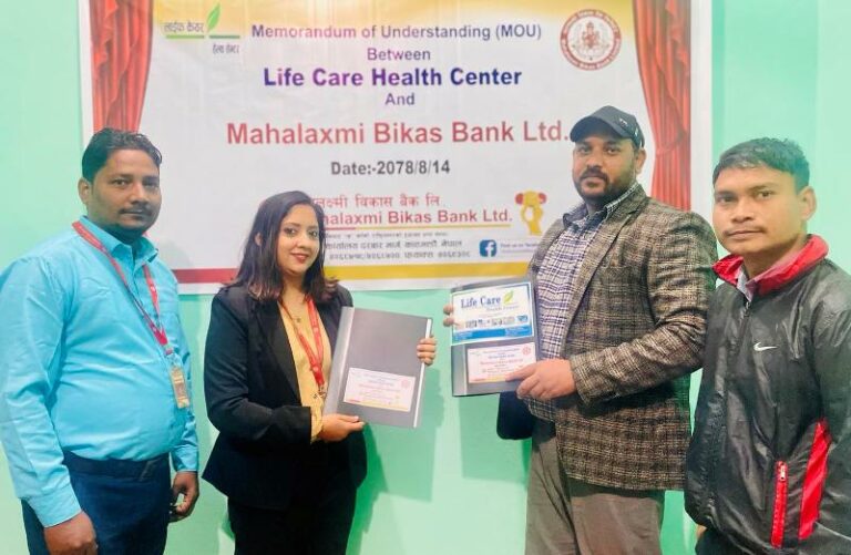 काठमाडौं, २६ मंसिर । महालक्ष्मी विकास बैंक र लाइफ केयर हेल्थ सेन्टरबीच सहकार्य हुने भएको छ । दुई कम्पनीबिच सहकार्य हुने सम्बन्धि समझदारी पत्रमा हस्ताक्षर भएको हो ।