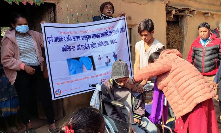 कञ्चनपुर, २६ मङ्सिर: शुक्लाफाँटा नगरपालिका– २ का असक्त अपाङ्गता भएका व्यक्तिका घर दैलोमै पुगेर कोरोनाविरुद्धको खोप लगाउँदै । लुथरन विश्व फेडरेसनको सहयोगमा राष्ट्रिय मुक्त हलिया समाज महासङ्घको समन्वयमा जिल्लाका नौ वटै स्थानिय तहमा कोरोनाविरुद्धको खोप अभियान सञ्चालन गरिएको छ ।-तस्वीर : राजेन्द्रप्रसाद पनेरु-रासस