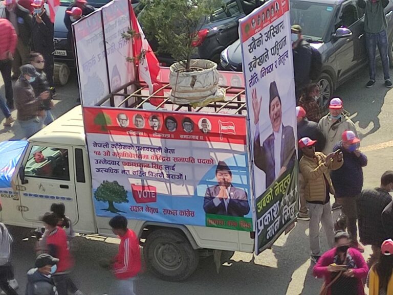 काठमाडौं, मंसिर २६ । नेपाली कांग्रेसको १४औँ महाधिवेशनमा आफ्ना नेतालाई निर्वाचन जिताउनका लागि शुभचिन्तक मत माग्नलाई व्यस्त छन् । शुक्रबारै पार्टीको उद्घाटन सत्र र बन्दसत्र सकाएको कांग्रेसले आजदेखि उम्मेदवारको मनोनयन दर्ता सुरु गरेसँगै आफ्ना नेताको पक्षमा माहोल निर्माण गर्न मत माग्न कार्यकर्ता व्यस्त छन् ।