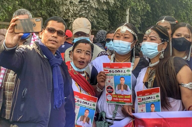 काठमाडौँ,२६ मङ्सिर: नेपाली काँग्रेसको १४ओैँ महाधिवेशनस्थल भृकुटीमण्डलमा आइतबार थारू भेषभूषामा सजिएका युवतीसँग सेल्फी खिच्दै कार्यकर्ता ।-तस्बिरः चन्द्रकला क्षेत्री-रासस