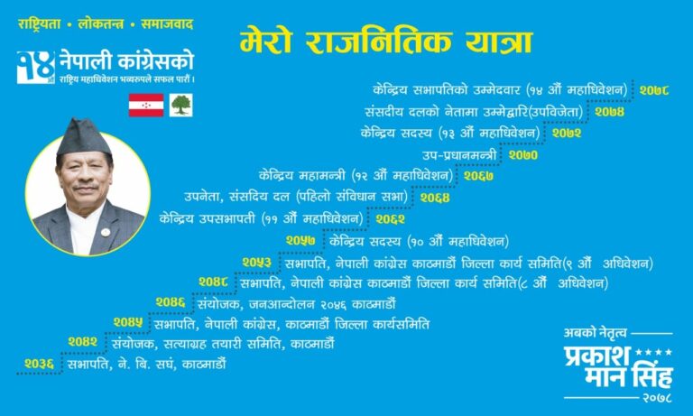 काठमाडौं, २६ मंसिर । नेपाली काँग्रेसका पूर्वमहामन्त्री प्रकाशमान सिंह २०४६ सालको जनआन्दोलनका सर्वोच्च कमाण्डर गणेशमान सिंहका पुत्र हुन् । उनको परिचय गणेशमान सिंहको पुत्रका रुपमा मात्र छैन । उनी काँग्रेस सभापतिका उम्मेदवार बनेका छन् ।