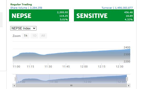 कारोबार सुरु भएदेखिनै आक्रामकरुपमा अघि बढेको नेप्से करिब दुई घण्टामा ११४.२५ अंकले बढेर २३९५.९३ अंकमा पुगेको छ ।