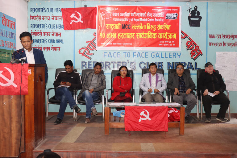 काठमाडौं, २८ मंसिर । नेपाल कम्युनिष्ट पार्टी माओवादी केन्द्र (समाजवादी)ले एमसीसी सम्झौताविरुद्ध सकलन गरेको १० लाख हस्ताक्षर सार्वजनिक गरेको छ । आज (मंगलबार) रिपोर्टर्स क्लब नेपालमा पत्रकार सम्मेलन गरेर उक्त पार्टीले मंसिर २३ गतेदेखि २८ गते (आज)सम्म देशव्यापी रुपमा एमसीसी विरुद्धको हस्ताक्षर संकलन गरेर सार्वजनिक गरेको हो ।