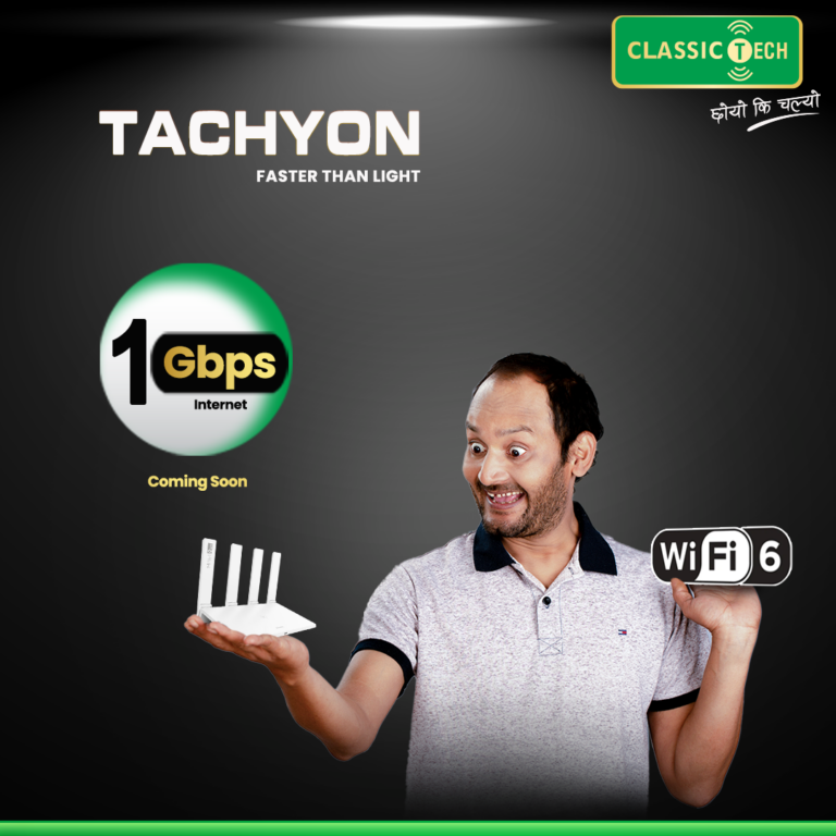 काठमाडौं, २९ मंसिर । नेपालमा सन् २००९ देखी शुभारम्भ भएको देशकै अग्रणी तथा ठूलो नेटवर्क सेवा प्रदायक कम्पनी क्लासिक टेकले नेक्स्ट जेनेरेशनको प्रविधी वाइफाइ ६ को साथमा TACHYON 1 Gbps इन्टरनेट सेवा शुभारम्म गर्ने तयारी गरेको छ ।