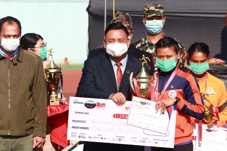 काठमाडौँ, ३ पुस: नेपाल भेटनरी एसोसिएशनद्वारा आज शनिबार आयोजित ‘रन फर प्रोटीन’ भन्ने नारासहित ‘ह्वील चेयर हाफ म्याराथन’का महिला तर्फका विजेता सन्तोषी श्रेण्ठ र पुरुष तर्फका विजेता तिर्थ पुनलाई पुरस्कार, प्रमाणपत्र तथा ट्रफी प्रदान गर्दै उपराष्ट्रपति नन्दबहादुर पुन लगायत ।-तस्वीर : प्रदीपराज वन्त,रासस