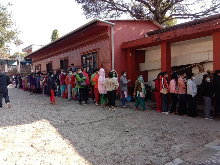 पाल्पा, ४ पुस: पाल्पाको तानसेनको भगवती मन्दिर परिसरमा कोरोनाविरुद्धको खोप लगाउनका लागि मानिस भीड ।-तस्वीर : कृष्ण दर्नाल-रासस