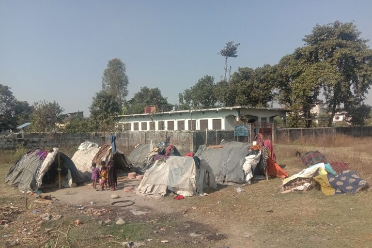 भजनी, ६ पुसः कैलालीको टीकापुर नगरपालिका–१ कृषि हाटबजार नजिकै त्रिपालमा बसेका नागरिक । पुसको कठिङ्ग्रिदो चिसो र शीतलहरको समयमा दिनभर मजदुरी गरी खाने यी परिवारको जीवन निकै कष्टकर छ ।-तस्बिरः झलनाथ खनाल-रासस