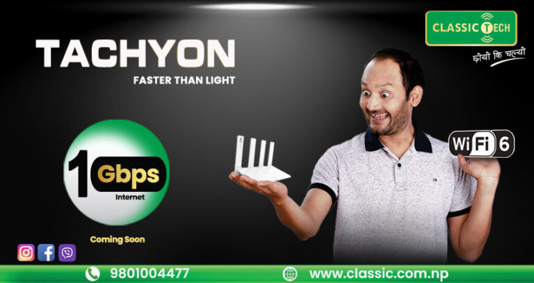 नविनतम प्रविधका साथ ग्राहकहरूलाइ छिटो तथा छरितो सेवा प्रदान गर्न क्लासिकटेक सदैव तत्पर रहेको छ। क्लासिक टेकले नेपालमै पहिलो पल्ट नेक्स्ट जेनेरेशनको प्रविधी वाइफाइ ६ र Triband राउटरको साथमा टाकियन (TACHYON) 1 Gbps इन्टरनेट सेवा भित्राउने घोषणा समेत गरेको यहाँहरूलाइ अगवत नै रहेको छ ।