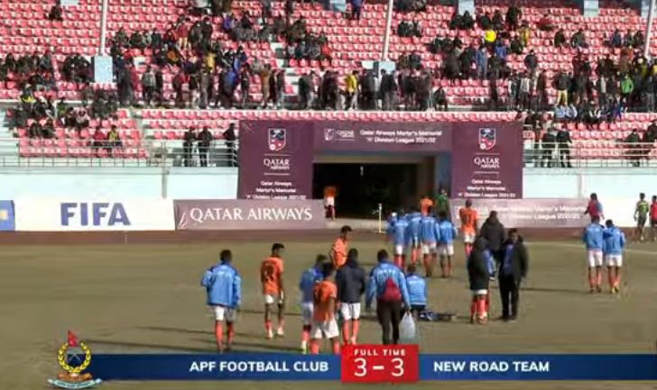 त्रिपुरेश्वरस्थित दशरथ रंगशालामा भएको खेलमा एपीएफ र एनआरटीले ३–३ गोलको बराबरी खेलेको हुन् ।