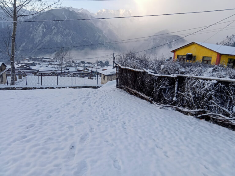 सिमकोट, १० पुस । हिमाली जिल्ला हुम्लामा शनिबार बिहानदेखि हिमपात । हिमपातबाट जिल्लामा अत्यधिक चिसो कारण सर्वसाधारणलाई कष्टकर भएको छ । तस्वीरः दाने बोहरा÷रासस