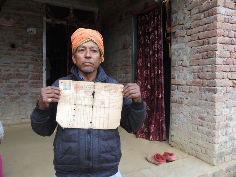 कञ्चनपुर, १२ पुस: कञ्चनपुरको बेलौरी नगरपालिका–१ पmटैयामा २०५९ सालदेखि आफ्नो १५ कट्ठा जमिन भारतीयले नियन्त्रणमा लिएको भन्दै लालपूर्जा देखाउँदै करनबहादुर सुनार । सुनारले उक्त जग्गाको तिरोर तिर्दै आइरहेको भए पनि जग्गा भने भारतीय सुरक्षाकर्मीको अवरोधका कारण भोगचलन गर्न पाइरहेका छैनन् ।-तस्वीरः शेरबहादुर सिंह-रासस