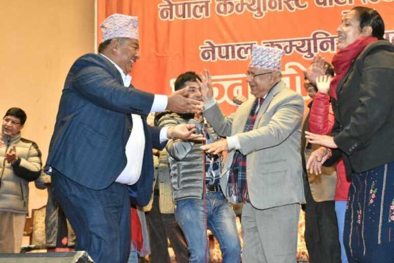 घोषणा कार्यक्रममा कलाकारले गीत प्रस्तुत गरिरहँदा अध्यक्ष नेपाल छमछमी नाँचेका थिए । उनीसँगै श्रममन्त्री कृष्णकुमार श्रेष्ठ र बाग्मती प्रदेशका मुख्यमन्त्री राजेन्द्र प्रसाद पाण्डे पनि नाँचेका थिए । अध्यक्ष नेपालले सम्बोधनेका क्रममा उत्पादनमा समय खर्चिएर आफूलाई अनुशासनमा बाँध्न सक्नुपर्ने बताएका थिए । तस्विर : मुकुन्द कालिकोटे, रिपोर्टर्स नेपाल डटकम