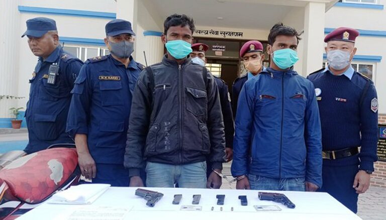इनरुवा, १३ पुसः सुनसरीको कोशी गाउँपालिका–१ लौकहीमा रहेको बिएस होटलबाट हतियारसहित पक्राउ परेका भारत अररिया पञ्चायत बासमतिया–६ बस्ने विद्यानन्द राम र बसमतिया –२ का हासिम अन्सारीलाई मङगलबार सार्वजनिक गर्दै जिल्ला प्रहरी कार्यालय सुनसरी ।-तस्बिर : अजितकुमार झा-रासस