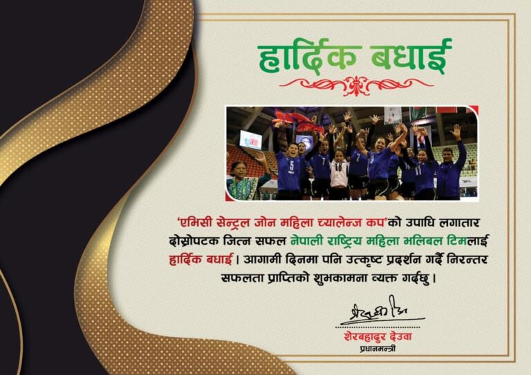 प्रधानमन्त्री देउवाले आगामी दिनमा पनि उत्कृष्ट प्रदर्शन गर्दै निरन्तर सफलता प्राप्तिका लागि नेपाली महिला भलिबल टोलीलाई शुभकामना दिएका छन् । बङ्गलादेशमा मङ्गलबार सम्पन्न फाइनल खेलमा नेपाली महिला भलिबल टोलीले उज्वेकिस्तानलाई ३–२ सेटमा पराजित गर्दै उपाधि जितेको हो । ढाकास्थित शाहिद सूरवार्दी इन्डोर रङ्गशालामा नेपालले प्रतिस्पर्धात्मक खेलमा उज्वेकिस्तानलाई २६–२४, २४–२६, २५–१५, २५–२२ र १५–११ अङ्कले पराजित गरेको हो ।
