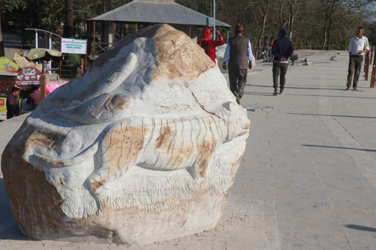 चितवन, १४ पुस । चितवन राष्ट्रिय निकुञ्जको मुख्य प्रवेशद्वार सौराहामा ढुङ्गामा निर्माण गरिएको दुर्लभ वन्यजन्तुको मूर्ति । राप्ती नदी किनारका ढुङ्गाहरुमा दुर्लभ एक सिङ्गे गैँडा, पाटेबाघ, घडियाल गोही, अजिङ्गरलगायतका मूर्ति कुँदिएको छ । तस्वीरः टेकराज पोखरेल÷ रासस