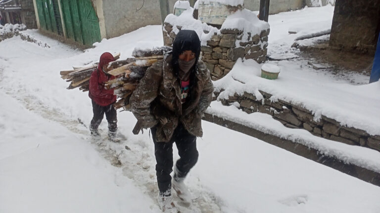 सिमकोट, १४ पुस । हुम्लामा भारी हिमपात हुँदा पनि साढे एक घण्टाको बाटो डाँडाफाया गाउँबाट हिँडेर सदरमुकाम सिमकोटमा दाउरा बिक्री गर्न पुगेका बालक । तस्वीरः दाने बोहरा÷रासस