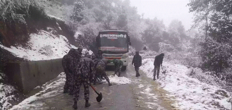 राजमार्गको हिउँ सफा गर्दै नेपाली सेना