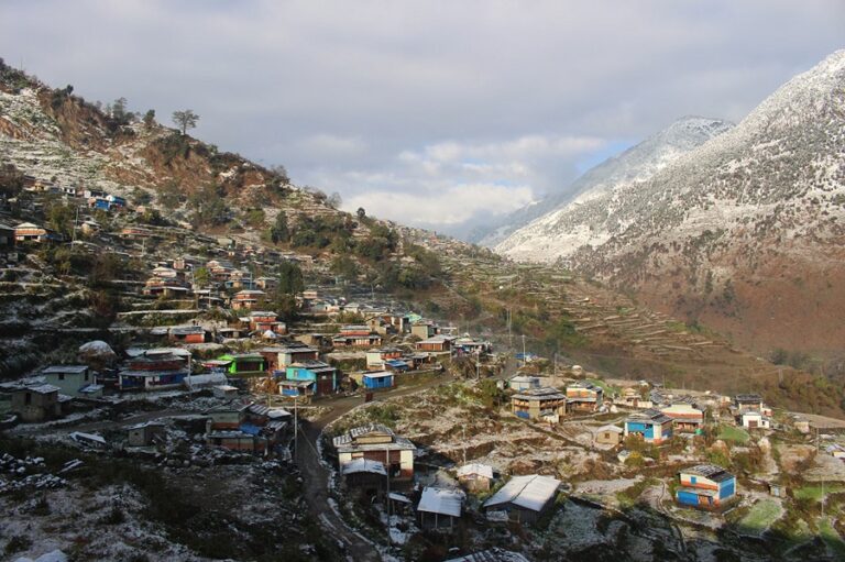 म्याग्दी, १५ पुस: हिउँले छोपिएको म्याग्दीको धवलागिरि गाउँपालिका–३ को मुना गाउँ । म्याग्दीका अधिकांश लेकाली बस्ती हिउँले सेताम्य भएको छ भने चिसोले जनजीवन कष्टकर बनेको छ ।-तस्वीर सन्तोष गौतम-रासस