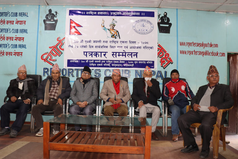 काठमाडौं, १६ पौष । राष्ट्रिय एकता परिषद्ले राष्ट्र निर्माता पृथ्वी नारायण शाहको ३००औं जन्मजयन्ती तथा राष्ट्रिय एकता दिवसको दिन सार्वजनिक विदा दिन माग गरिएको छ । आज (शुक्रबार) रिपोर्टर्स क्लब नेपालमा पत्रकार सम्मेलन गरेर परिषद्ले राष्ट्रिय एकता दिवसको रुपमा उक्त दिन सार्वजनिक बिदा दिन माग गरेको हो ।