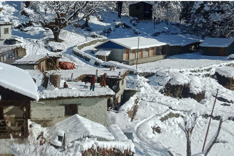 जाजरकोट, १७ पुस । डोल्पाको माझफाल गाउँमा भएको भारी हिमपात । हिउँ परेपछि हिउँदे बाली राम्रो हुने भएकाले किसान खुशी छन् भने हिमपातका कारण यहाँको जनजीवन कष्टकर बनेको छ । तस्बिरः हेमन्त केसी÷रासस