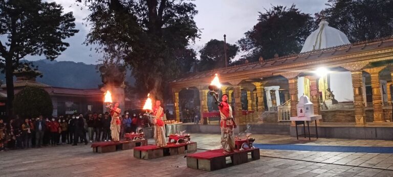 बेनी, १८ पुस: पोखराको प्रसिद्ध धार्मिकस्थल विन्ध्यवासिनी मन्दिरमा सन्ध्याकालीन आरती गरिँदै । पछिल्ला दिनमा पोखराका विभिन्न ठाउँमा हुने आरती सबै धर्मावलम्बी र विभिन्न उमेर समूहका पर्यटक एवं स्थानीय बासिन्दाको लागि आकर्षक बन्ने गरेको छ ।-तस्वीर : कमल खत्री-रासस