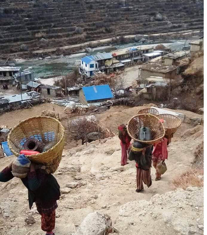 खलङ्गा, २१ पुस । दुई दिनसम्म गाउँमा खानेपानी नआउँदा सेरी बजारबाट डोकोमा बोकेर खानेपानी घर ल्याउँदै जुम्लाको तिला गाउँपालिका – १ का बासिन्दा । तस्बिरः विजय रावत÷रासस