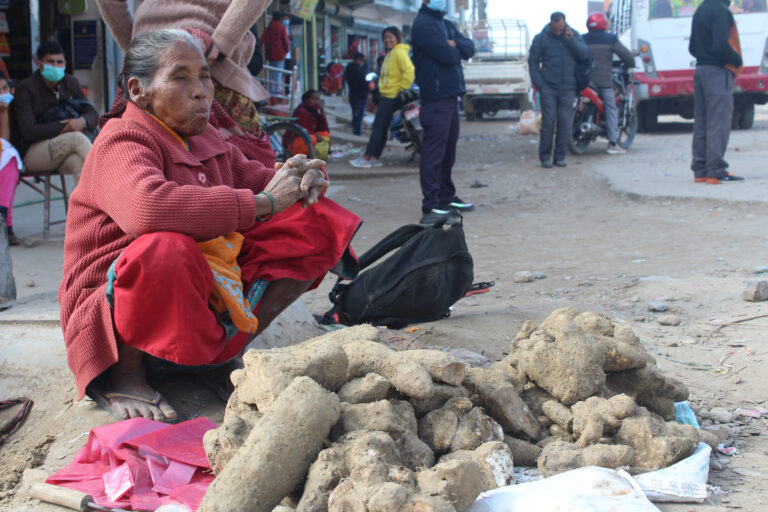 देउखुरी, २८ पुस । माघी पर्वमा विशेष महत्वपूर्ण मानिने तरुल बिक्रीका लागि घोराही बजारमा ग्राहक पर्खाइमा महिला । तस्वीरः रञ्जिता अधिकारी÷रासस