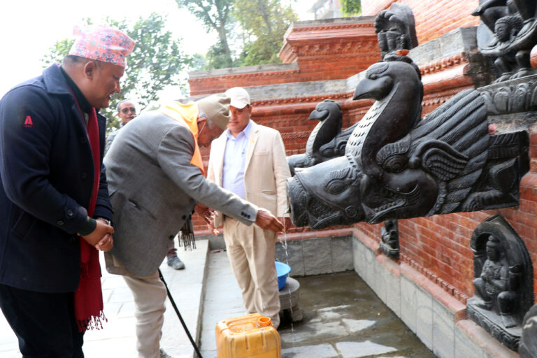 भक्तपुर, २८ पुस । मध्यपुरथिमि नगरपालिकाले निर्माण गरेको शङ्खधर पार्कको ढुङ्गेधारा अवलोकन गर्दै वाङ्मय शताब्दी पुरुष सत्यमोहन जोशी । साथमा नगर प्रमुख मदनसुन्दर श्रेष्ठ । तस्बिरः रमेश गिरी÷रासस