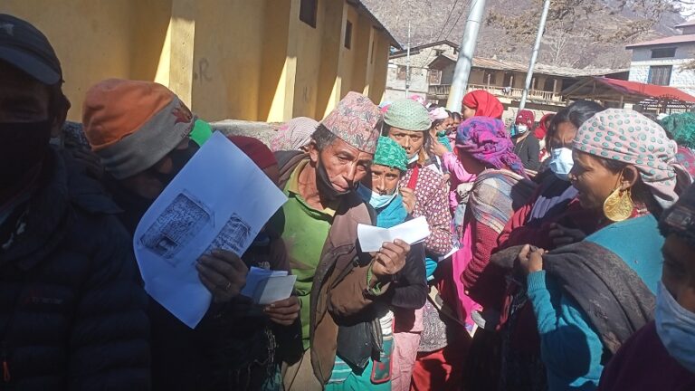 सिमकोट, ३० पुस : हुम्लाका नागरिकले चार केजी चामलका लागि नागरिकता पेश गर्नुपर्ने । नेपाल खाद्य व्यवस्था तथा व्यापार कम्पनी लिमिटेडले तीन महिनापछि चामल वितरण गरेपछि पालो पर्खिंदै गरेका सर्वसाधारण ।-तस्वीर : दाने बोहरा÷-रासस