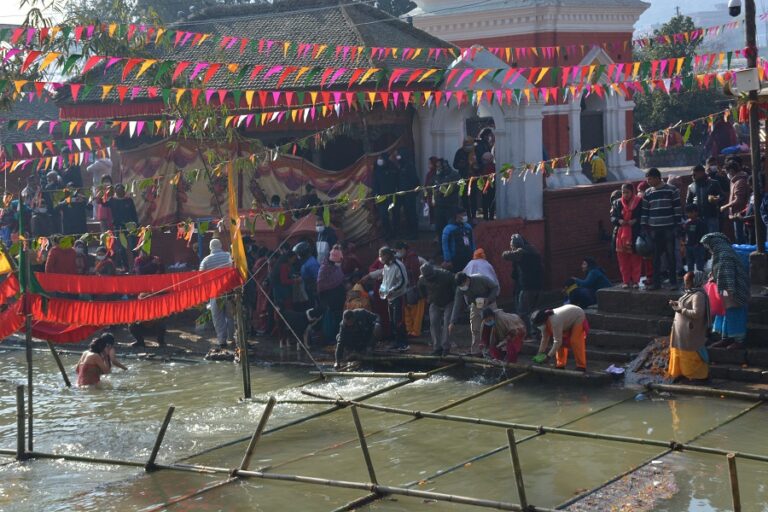 बनेपा, १ माघ: काभ्रेपलाञ्चोकको पनौती नगरपालिका वडा ६ र ७ को संगमस्थल पनौती त्रिवेणीघाट क्षेत्रको मन्दिर परिसरमा सुरु भएको बाह्र बर्षमा लाग्ने मकर स्नानको पहिलो दिन शनिवार पुण्यमाता खोलामा स्नान गर्दै भक्तजनहरु । स्नान एक महिनासम्म लाग्नेछ ।-तस्वीर : पेमा लामा, रासस