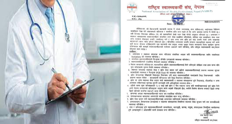 काठमाडौं, ४ माघ । राष्ट्रिय स्वास्थ्यकर्मी संघले स्वास्थ्यकर्मीको मनोबल बढाउन १३ बुँदे माग अगाडि सारेको छ। स्वास्थ्यकर्मीहरु कोरोना संक्रमित हुन थालेपछि स्वास्थ्यकर्मीको मनोबल बढाउन संघले उक्त बुंदा अगाडि सारेको हो।