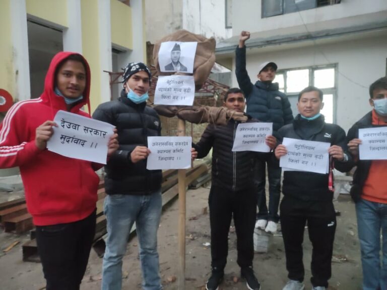 हाम्रा सहकर्मी मुकुन्द कालिकोटेकाअनुसार शंकरदेव क्याम्पसअगाडि अनेरास्ववियुका विद्यार्थी भेला भएर प्रधानमन्त्रीको पुत्ला जलाएका हुन् । विरोधको क्रममा प्रदर्शनकारीले मूल्यवृद्धि तत्काल फिर्ता लिन माग गरेका छन् ।