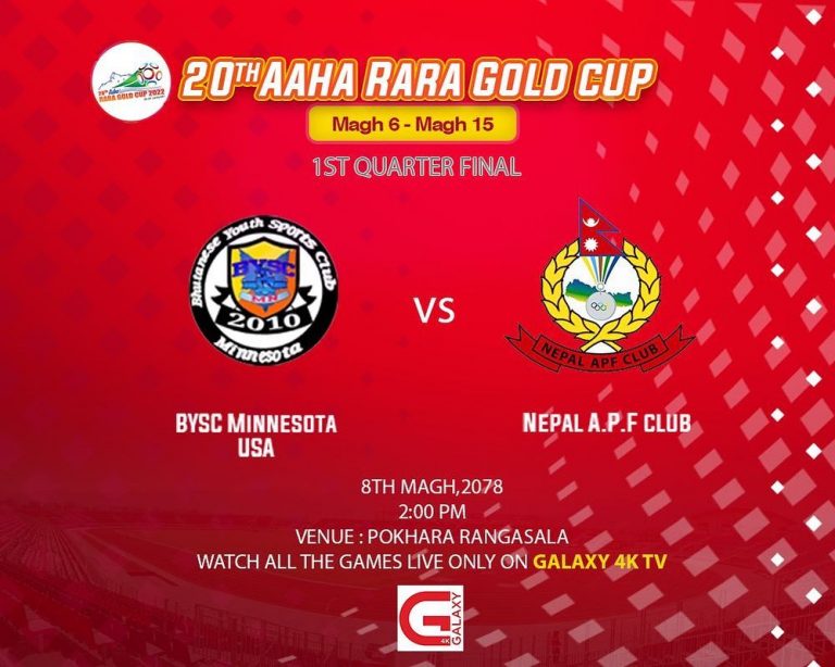 आज हुने खेलमा विभागीय टिम नेपाल एपीएफ क्लब र बिवाइएसी मिनेसोटा युएसएबीच प्रतिस्पर्धा हुनेछ । पारेखरा रंगशालामा हुने खेल दिउँसो २ः३० बजे सुरु हुनेछ ।