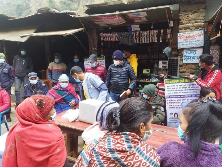मान्म, ९ माघ : कालीकोटको शुभकालिका गाउँपालिका–१ जितेबजार क्षेत्रमा कोरोना बिरुद्धको खोपका लागि गाउँगाउँ घुम्ती शिविर सञ्चालन गर्दै जिल्ला स्वास्थ्य कार्यालय कालीकोटका स्वास्थ्यकर्मी ।-तस्वीर : मिमबहादुर रावल, रासस