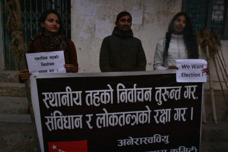 सरकारले स्थानीय तहको निर्वाचन मिति घोषणा गर्नमा ढिलाइ गरिरहेको आरोप लगाउँदै युवा संघ र अनेरास्ववियुले देशैभर प्रदर्शन गरिरहेको छ । युवा संघका स्थायी कमिटी सदस्य निवेश यादवका अनुसार सरकारले स्थानीय तहको निर्वाचन पर धकेल्ने षड्यन्त्र गरिरहेको दबाब दिने उद्देश्यले विरोधका कार्यक्रम भइरहेको बताए ।