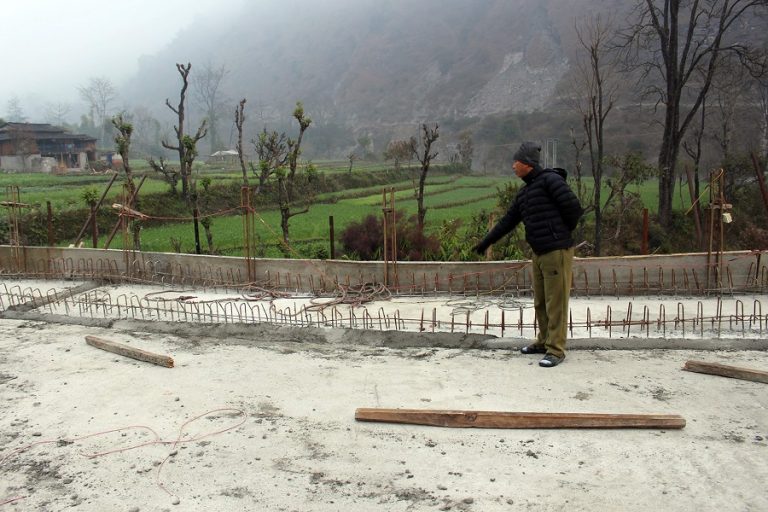 म्याग्दी, २० माघ: निर्माण नसकिँदै भाँसिन थालेको बेनी नगरपालिका–४ र मङ्गला गाउँपालिका–३, पखेरस्थित म्याग्दी नदीमाथि निर्माणाधीन पुलको दबेको भाग देखाउँदै स्थानीयवासी । तीन दिनअघि ढलान भएको पुलको दायाँ र बायाँ भाग दबेर भासिन थालेको छ ।-तस्बिरः सन्तोष गौतम-रासस
