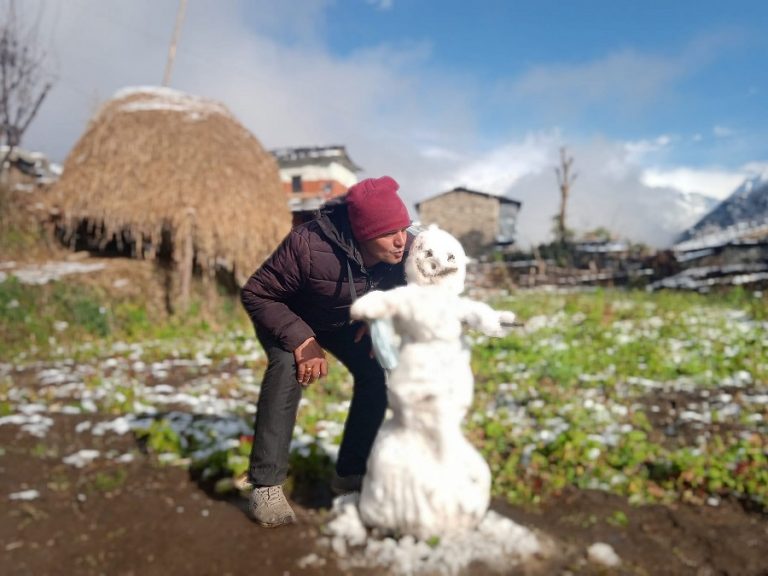 गलेश्वर, २३ माघ: म्याग्दीको धवलागिरि गाउँपालिका– ७, ताकममा शनिबार हिउँको मानवाकृति बनाएर तस्बीर खिचाउँदै एक स्थानीय युवा ।-तस्वीर: ध्रुवसागर शर्मा-रासस