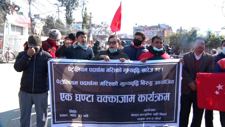 काठमाडौं, २३ माघ । नेत्रविक्रम चन्द ‘विप्लव’ नेतृत्वको नेकपाको संयुक्त जनवर्गीय संगठनले पेट्रोलियम पदार्थको मूल्यवृद्धिको विरोधमा आज काठमाडौंमा एक घण्टा चक्का जाम गरेका छन् ।