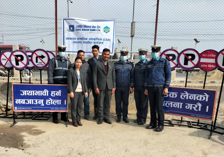 बिहीबार आयोजित कार्यक्रममा ज्योति विकास बैंकको तर्फबाट बैंकका कोटेश्वर शाखाका शाखा प्रबन्धक किशन खड्काले महानगरीय ट्राफिक प्रहरी प्रभाग कोटेश्वरका इन्स्पेक्टर राम कृष्ण देवकोटालाई विभिन्न ट्राफिक व्यवस्थापन बोर्डहरू हस्तान्तरण गरेका हुन् ।