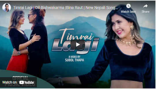 काठमाडौँ, २५ माघ: करिब एक महिनाअघि ‘माया यस्तो होस्’ बोलको म्युजिक भिडियो सार्वजनिक गरेका युवा गायक दिल विश्वकर्माले नयाँ साङ्गीतिक सौगात ‘तिम्रै लागि’ दर्शकमाझ ल्याएका छन् । प्रणय दिवसको अवसर पारेर गायक विश्वकर्माले यो म्युजिक भिडियो सार्वजनिक गरेका हुन् । गीतमा गायक विश्वकर्माको स्वर, शब्द र सङ्गीत तथा सुदिप सागरको सङ्गीत संयोजन रहेको छ । प्रेमिल जोडी बीचको प्रेम र आकर्षणलाई आधार बनाएर प्रस्तुत गरिएको उक्त भिडियोमा गायक विश्वकर्मा र बिना राउतको अभिनय छ ।