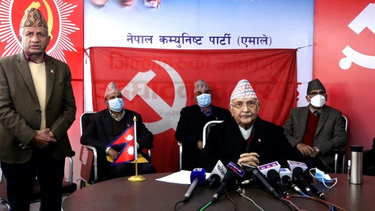 ‘चुनाव हुन नदिने रचुनाव रोक्न खोज्ने गठबन्धनमा छन्,’ ओलीले पार्टी केन्द्रीय कार्यालय थापाथलीमा आयोजित पत्रकार सम्मेलनमा भने,‘हामी कसैलाई चुनावबाट भाग्न दिदैनौं र चुनाव जित्छौं ।’