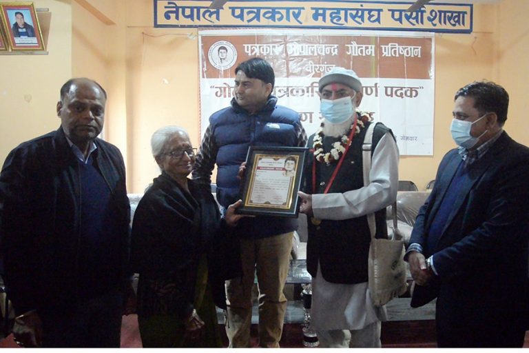 गोपालचन्द्र गौतम प्रतिष्ठानले आज वीरगञ्जमा आयोजना गरेको ११औँ पुरस्कार वितरण समारोहमा वीरगञ्ज महानगरपालिकाका प्रमुख विजयकुमार सरावगीले पत्रकार झालाई एक तोला सुनको पदक र प्रमाणपत्रले सम्मानित गरेका हुन् ।